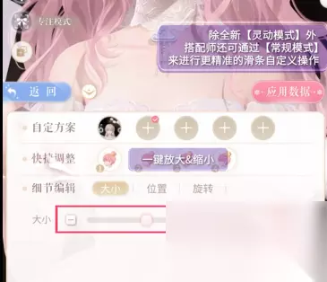 3. 精准调整模式(滑条操作) 通过「大小滑条」精确调整尺寸; 通过「位置/旋转三轴滑条」微调部件坐标(如图7); 支持「分组操作」:选择「一键操作」或单独调整部件组(如图8); 可「隐藏」部分分组装饰以简化搭配(如图9)。