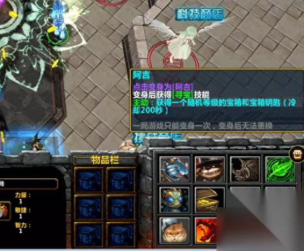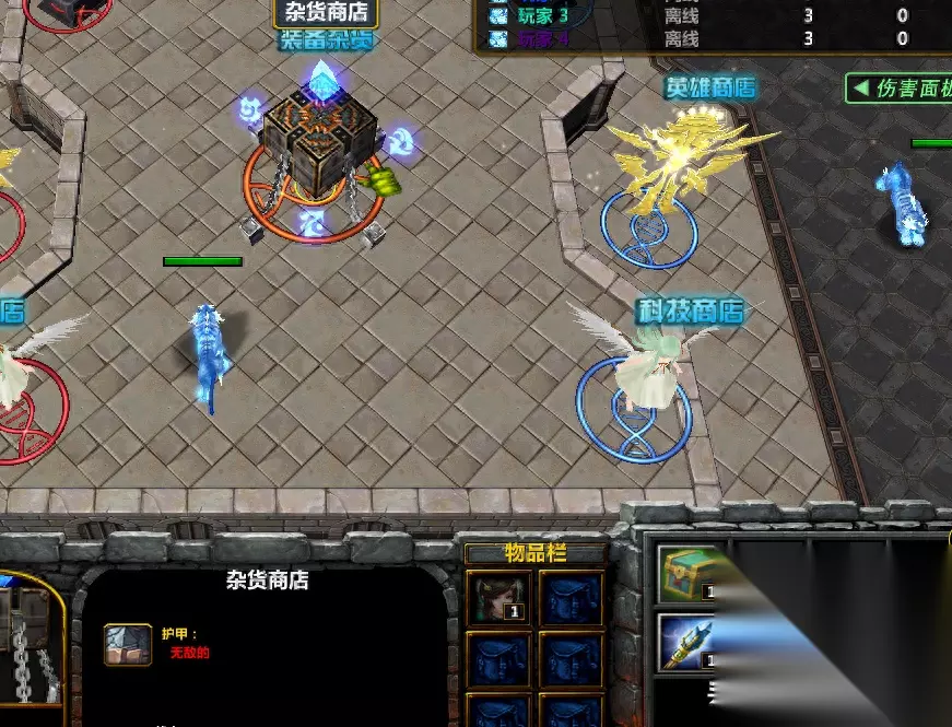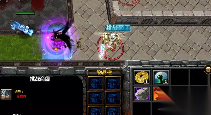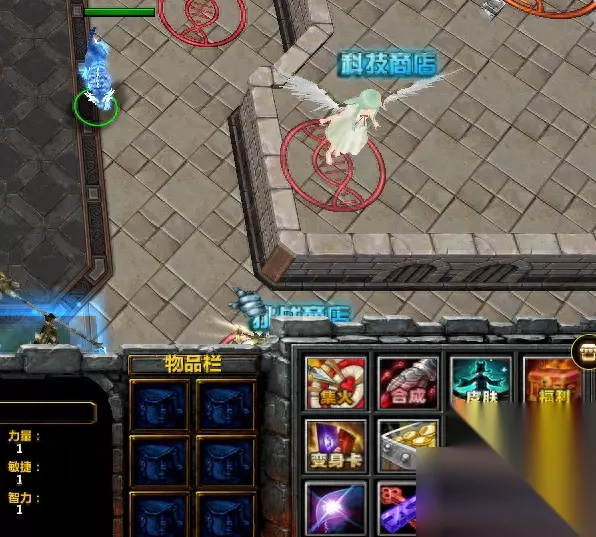 根据自己的钱可以购买绿色装备(1000)、蓝色装备(3000)、紫色装备(9000). 这里推荐最低买3000装备,3个相同品质的装备可以合成升级,在f1小角色的第一行第二个按钮。 最后一个就是成品装备店了,20波结束后才会开启,里面的装备是固定时间刷新的,但是价格要比随机装备贵