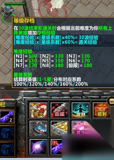 做完这些之后,就是每个RPG地图最重要的东西,也是平民挑战更高难度的基础——地图存档 完成一局游戏后,使用过的英雄可以获得一定的经验,除此之外还会有额外的通用经验(可以给任意英雄升级) 这个等级不是提升星级,而是提升英雄的基础属性。具体操作在屏幕的左上角,一个类似火焰的标志