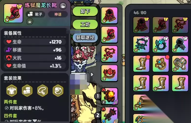 圣光使者套: 击败冰霜峰后或战争领主等固定BOSS,有几率掉落。由铠甲、项链、戒指三件套构成,每次恢复生命值最多可达1000点,并且增加150点的移速。这件套装的特殊效果是可以提供15%伤害减免和生命恢复效果,搭配被动“血量上限提升”可大幅增强容错率。