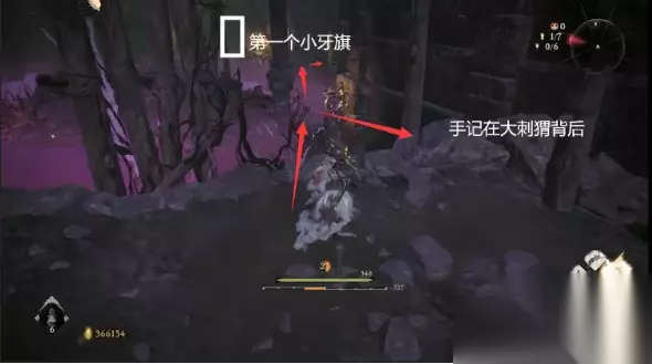 右后转弯大刺猬这边可以找到本关卡的第一个手记,交给天柱派那个女NPC可以获得不痛不痒的道具一堆 接着贴右边走到底进入,水里有个躺尸,左边开门进入是我们的第一个小牙旗位置