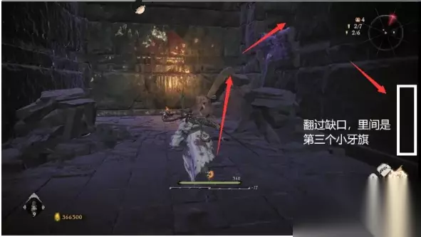 接着往前,下面跳杀胖胖起手,跳到对面缺口房间内是第三个小牙旗点