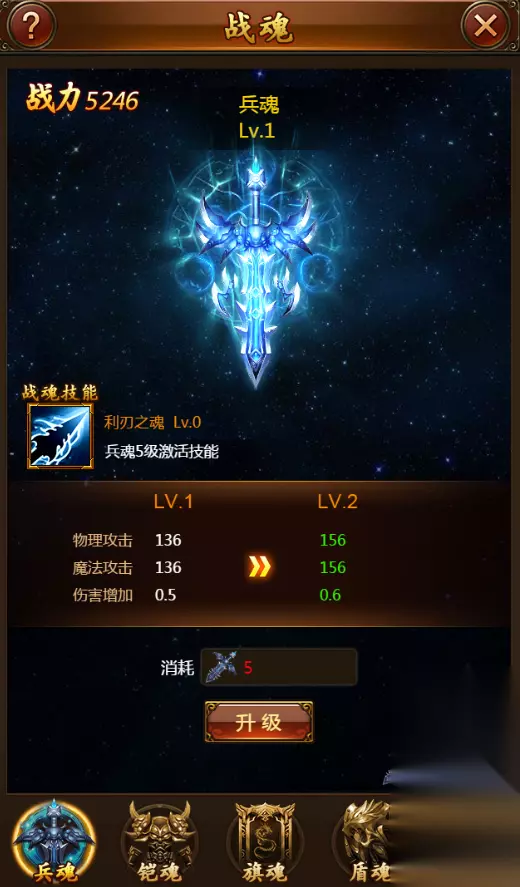 【生死由命,刀剑有魂】 开启装备升华新纪元,打造战斗新格局,带来战力极致飙升! 战魂系统来袭 加成属性飙升战力 在正版授权的《真王h5》全新微端版本中,战魂系统即将耀世来袭,为勇士们提供更强大的属性加成机会。当玩家获得战魂碎片后,就可以将兵魂、铠魂、旗魂、盾魂对应升级。