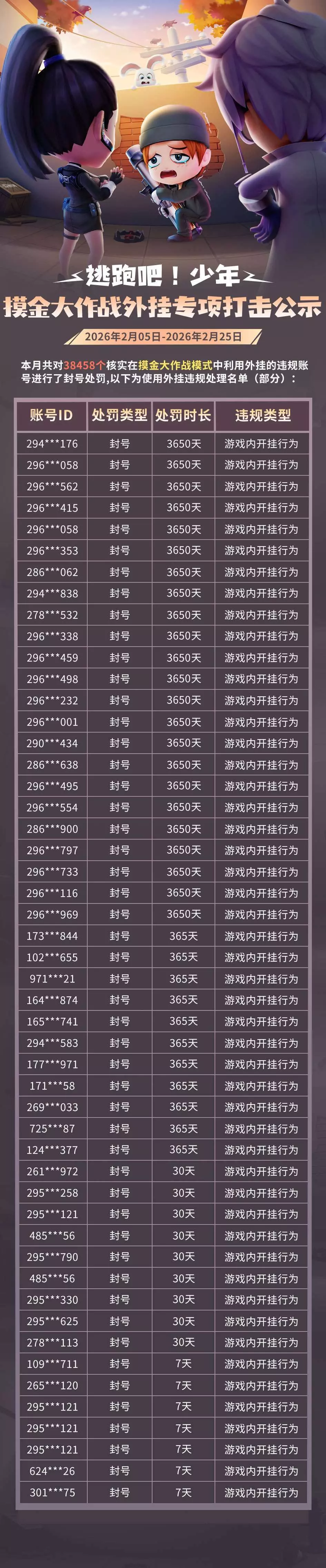 【摸金大作战模式】安全处罚公示(02月05日——02月25日)