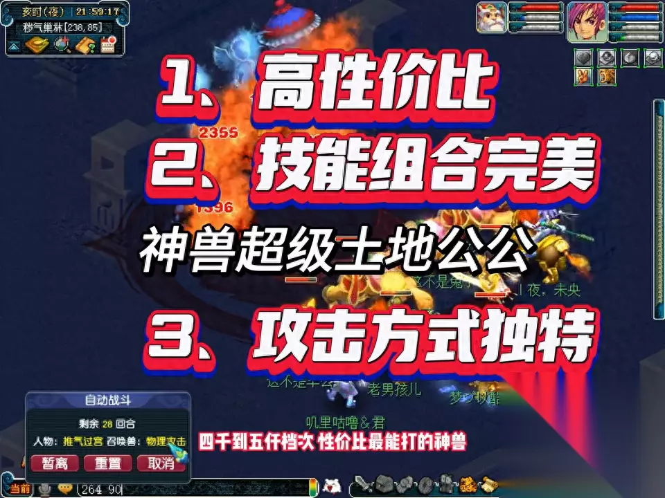 神兽超级土地公公:1、高性价比!2、技能组合完美!3、攻击方式独特。 四千到五千档次性价比最能打的神兽,你猜到了么?就是土地公公其技能搭配完美,主力技能高级必杀、高级偷袭夜战、高级夜战、低级夜战,使用效果差不多。辅助技能高级神佑、高级敏捷、加上套装带、高级偷袭,没有任何短板。