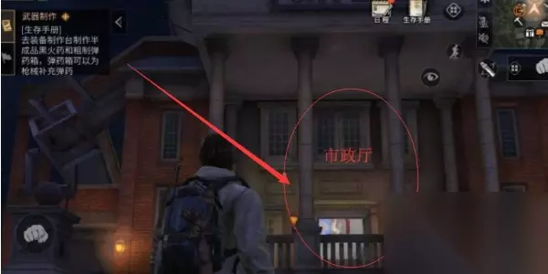 第二步:前往市政厅的二楼,在二楼外面去市政厅屋顶的楼梯上可以找到NPC狂猎女生;