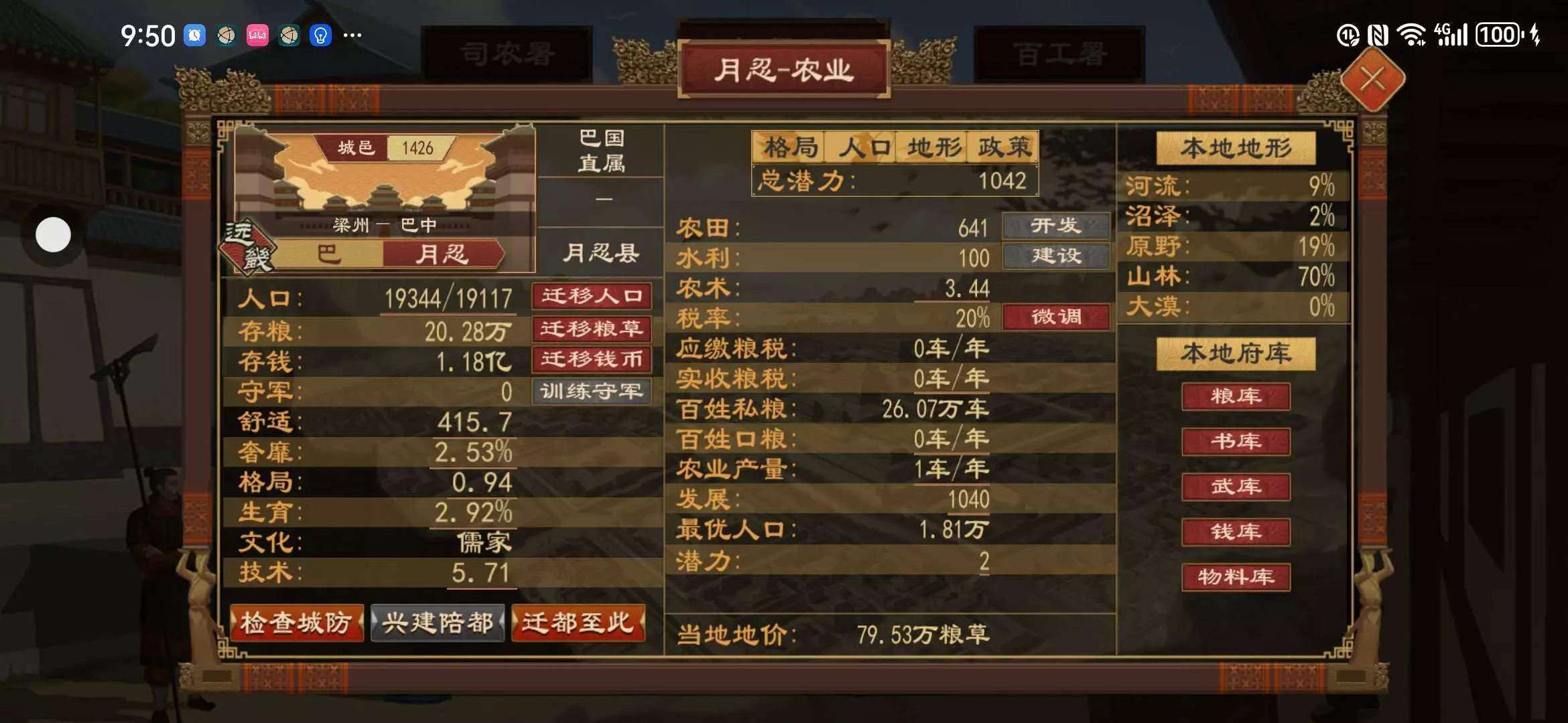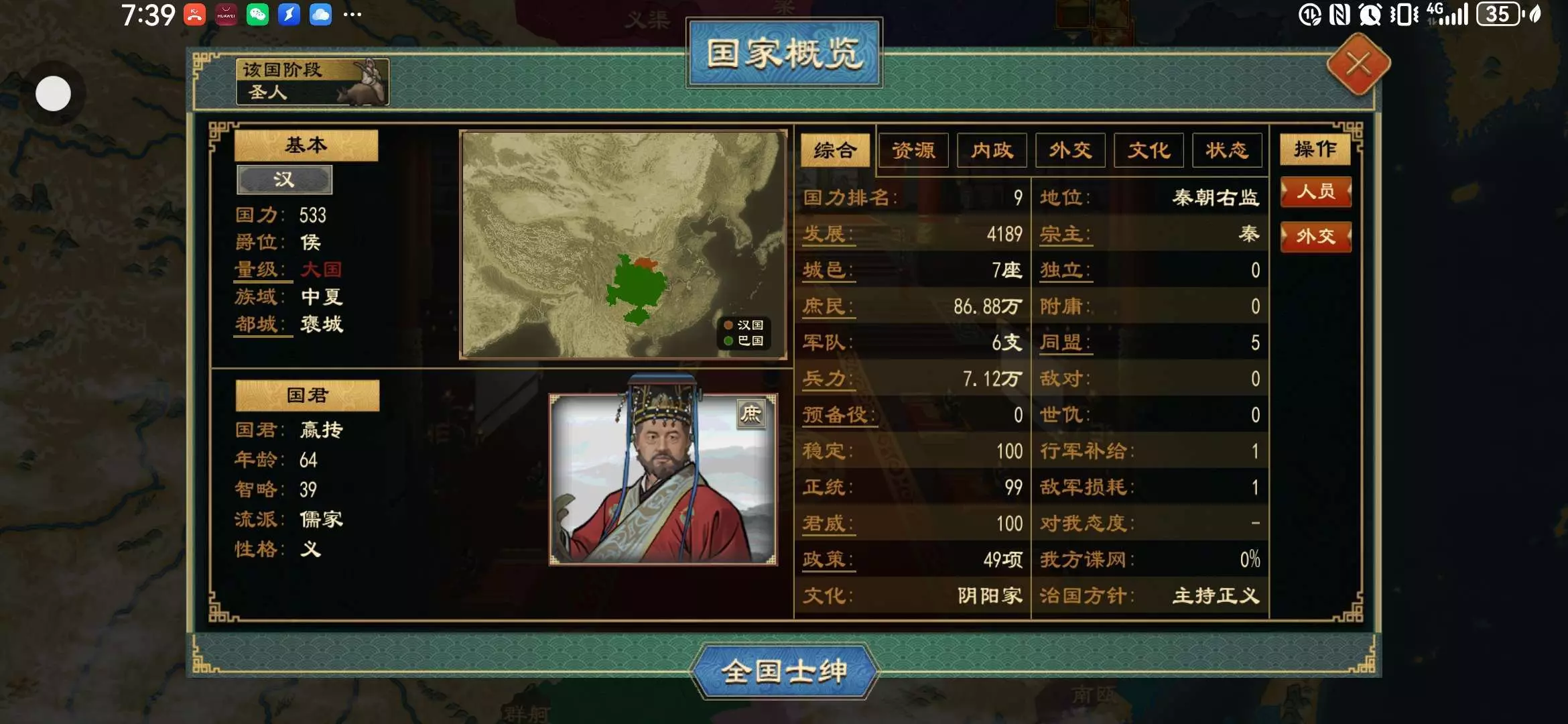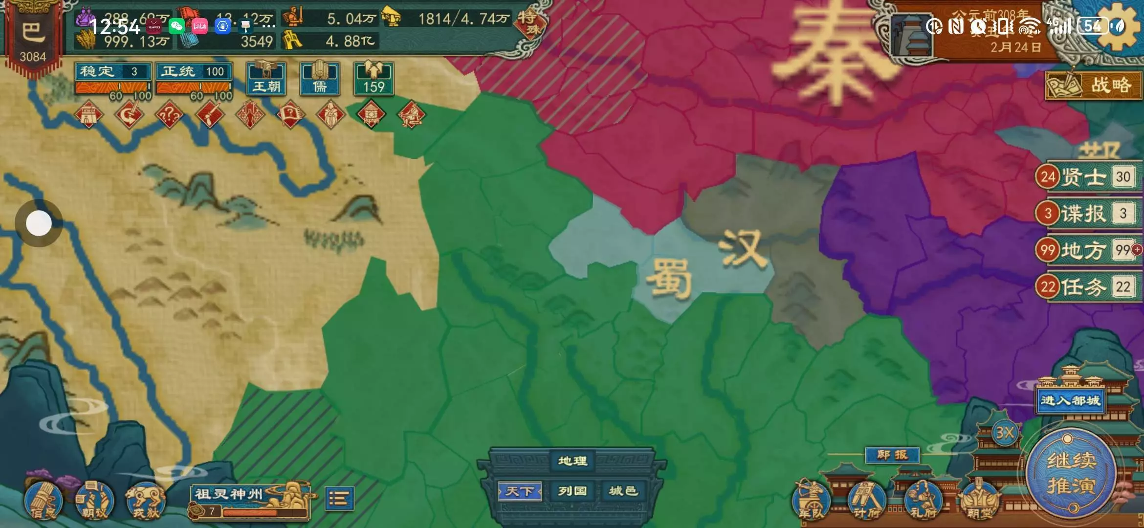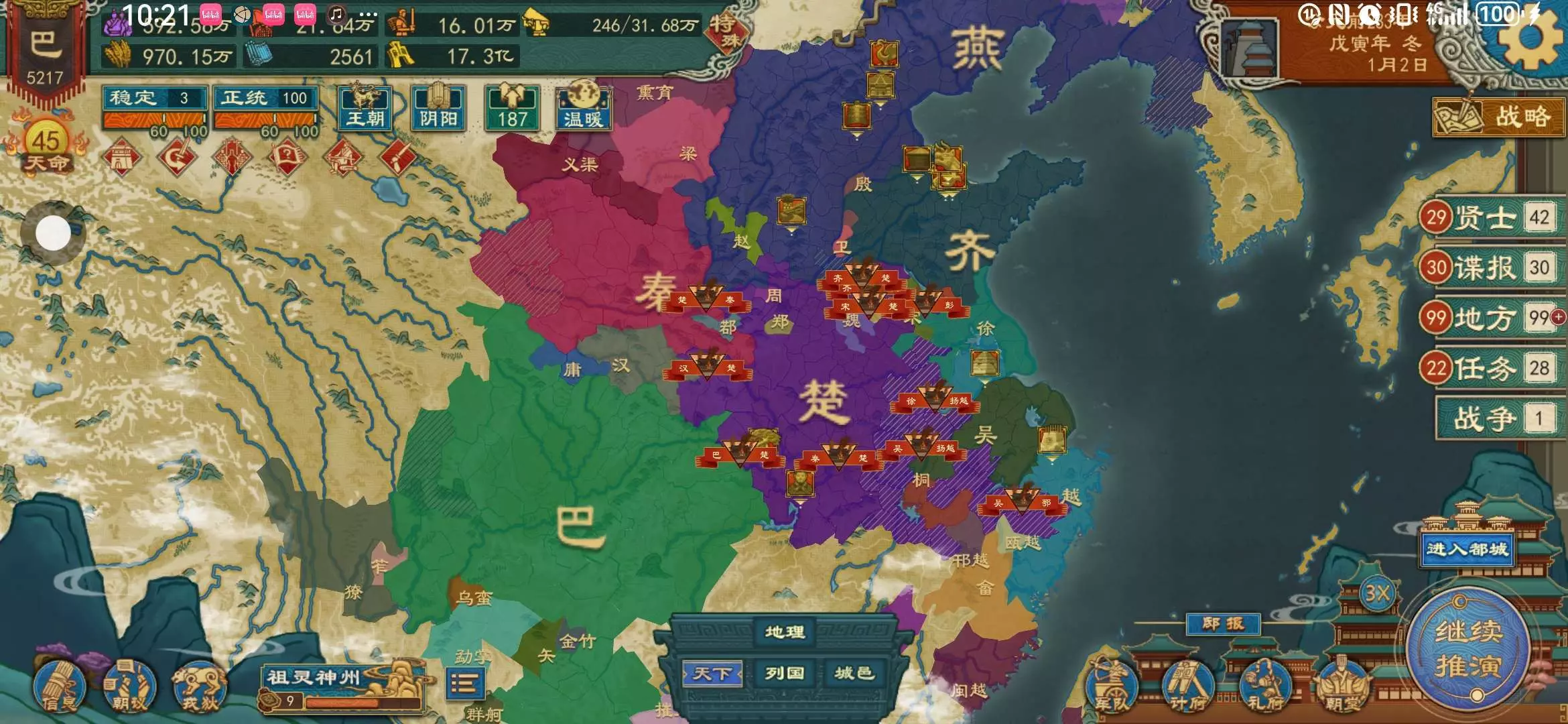 开局被蜀,楚两国同时宣,新版本投降惩罚太痛,但不得不投。而且还是方国阶段,点政策很难,还随时会被楚国宣统一四海,资源只有盐,漆胶,树林,兽群,只能去开垦或者拿蜀国的地,兵种基本只能养弓兵(其他的武器提供不上)技术也只有木石技术,青铜技术还得慢慢点。前期被楚国宣了,基本必死无疑。
