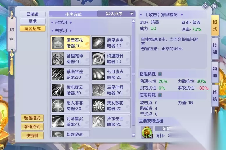 暗器的打法主要围绕招式机制展开,这一点大家从前期就需注意。游戏中的招式有着力敌、灵巧、普通和群攻四种抗性,战斗中我们要通过招式之间的相生相克不断取得优势。先从普通系开始,我们一共有雾里看花、绵里藏针和七月流火3个招式,这其中我们首先排除掉负抗较高的雾里看花。在《梦想世界3》中招式的抗性相当重要,我们要尽量避免使用负抗很高的招式。