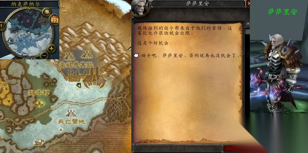 本文为魔兽世界怀旧服WLK玩家介绍“最后的义务”任务里萨萨里安NPC的位置:需传送至纳克萨纳尔,再前往上方传送阵到最上层即可找到他,对话开启剧情后击败任务怪就能完成任务。