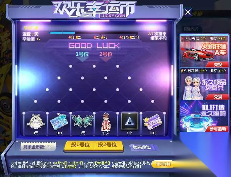 欢乐幸运币 为了迎接国庆7天长假的到来,小橘子为大家准备了有趣好玩的【欢乐幸运币】活动,赶快来投币免费赢取永久的极品奖励吧! 活动时间 9月25日~10月25日 活动规则 1、每天完成任务可获得幸运币,每次消耗1个幸运币可进行一次游戏。 2、硬币滚入哪个洞口中,即可获得对应的奖励!(有1号位、2号位可供选择哦!) 3、每天投硬币达2次、4次、7次,可分别获得红宝石、黄宝石。第7次有概率抽取到更多的宝石。 4、使用宝石可以兑换永久极品奖励!(红宝石可用于兑换永久赛车、座椅;黄宝石可用于兑换永久的装扮类物品) 如何获得更多的宝石? 在指定的时间段内,每登录一天的游戏,可获得+15的幸运值。幸运值越高,越大概率抽中更多的宝石。 幸运值在周期结束时会清零,当你获得了>1的红宝石(黄宝石不计算在内),幸运值也将清空。 幸运币抽奖奖励一览