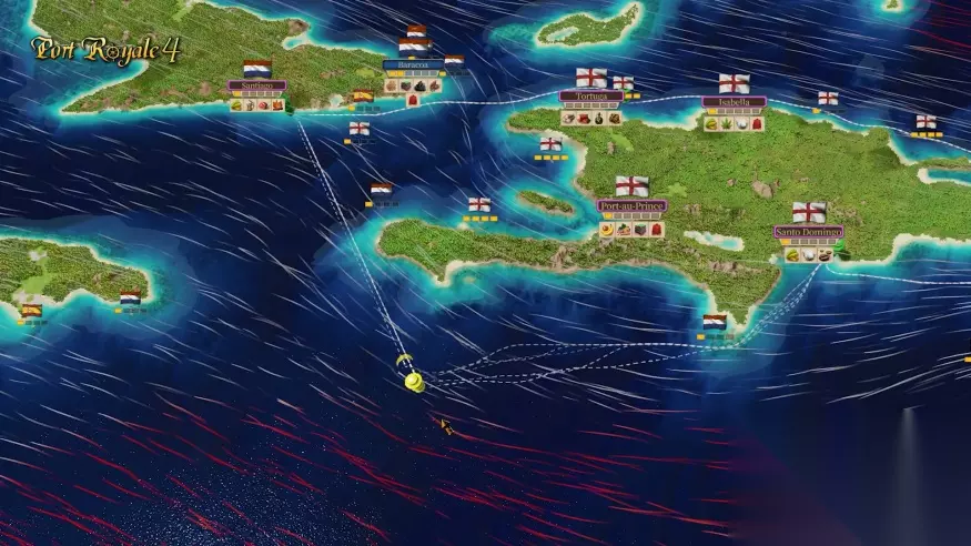 当然,加勒比海的经济离不开船队,玩家也必须从造船厂选购各类船舶并组成船队才能发展自己的经济(遗憾的是本代的数量目前来说不是很尽如人意)。尽管船队可以在没有船长的情况下工作,但可以提升船队效率并吸纳武装船只的船长仍然是不可或缺的关键,玩家也需要仔细考量每个船队的船长,船长的技能也会影响包括航行在内的各方各面。例如,有的船长可以允许船队航行至充满战火的海域以减少航行时间,但遭遇敌对舰队后则可能遭遇全灭的风险,船长的“船长战术”还将影响在海战时玩家的胜率,有些船长就完全不适合正面冲突。