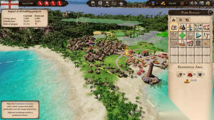 在城镇建设方面,游戏采取了网格式的设计,而如何在现有殖民地好感度以及最大化效益间权衡也是需要仔细思考和规划的严肃课题。随着游戏的发展,玩家还将解锁,包括可可种植园、陶器厂以及奢侈品工作坊在内的各类生产设施。需要注意的是,其中有些生产设置对附近的居民会产生负面效果(如农场的气味与嘈杂会让周围的居民不满),而四个同类的种植类型叠加则可受到生产加成影响。在游戏中,玩家需要注意的也不只是工人,因为只有数倍于工人的居住区和可接受的居住条件才能吸引到新血液的到来(因为工人还有孩子与家人需要住宿空间)。同时,不同建筑还会有叠加的光环效果,从而大幅影响居民满意度,并最终反应在到城镇的生产效率和贸易。