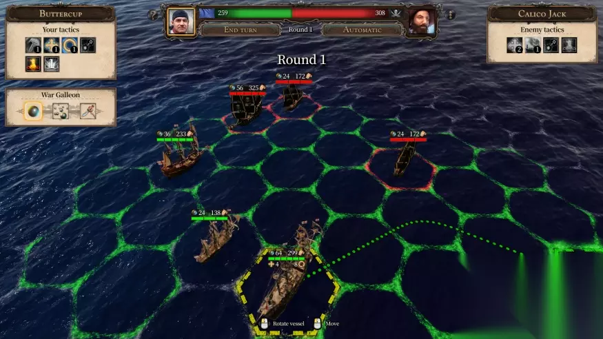 在自动战斗下,明显弱势的船队将立即投降,同时 AI 也不会使用各种战术和谋略。因此,在双方旗鼓相当的情况下,每次最多8只船只的回合制手动战斗会给玩家更大的灵活度和走位,而在几乎无望的情况下也有可能凭借巧妙的操作以及船舶和船长战术力挽狂澜。而在战局逐渐明的情况下,玩家可以在选择让自动战斗收尾,并且可以在选择前看到明确的结果。当然,由于抛弃了前作的即时战斗系统,战斗本身的乐趣和深度并不是十分理想,这也是目前游戏最大的遗憾之一。