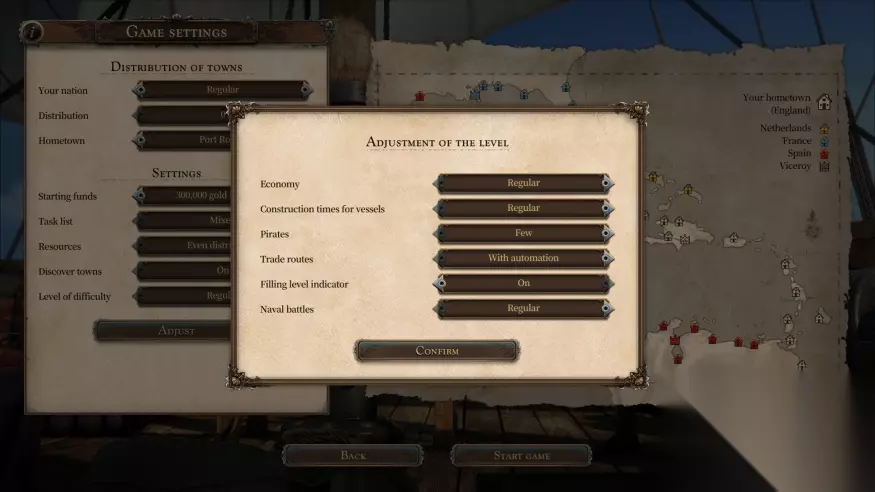 此外,游戏在设置中还有数个对游戏整体玩法和难度等级有着重要影响的设置,如资源中的区域性会限制某些某定物品只能在某些地区中被产出(如海岛棉就只会在巴巴多斯等地出现,价格也因此会在其他地区相对上涨) ,这会让游戏的难度有所增加,但同时也会给游戏带来更为多样的玩法,玩家还需要注意不能买空所辖地的急需物资,否则可能引起居民的不满。同样的,如果玩家认为自动贸易路线以及物价指示器让游戏太过轻松,玩家也可以关闭这二项,通过自行记录和对比来提升自己的游戏体验和乐趣。不过,贸易路线无法自动设定每个城市销售物品也让玩家在规划时略显繁琐。