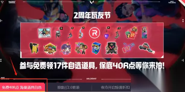 无畏契约二周年福袋口令 口令1:瓦友节 口令2: Valorant 口令3: 无畏契约两周年 口令4:生日快乐 口令5:盐海矿镇 口令6:给给给给给给我一个福袋 口令7:无畏契约启动 口令8:花火当燃 口令9:叽里咕噜说什么呢瓦酷酷送你了 口令10: 谁有多余资金 口令11: 我是学生送我 口令12: 瓦友起立 无畏契约二周年福袋怎么领 1、打开无畏契约官网首页,点活动区找「免费40R点+海量道具自选」