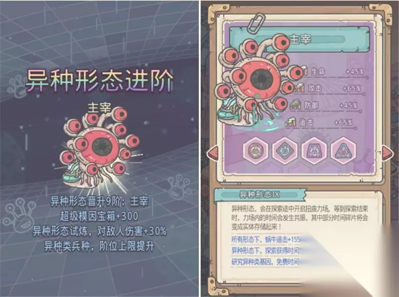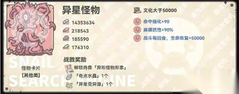 【最强蜗牛异种9形态仪式流程】 异种9仪式整体难度不算大,奖励也还不错。唯一的问题是耗时较长,最快也得14天才能完成,步骤2需要每天上线记得做。 1. 本体属性 ① 异种形态下,四维加成+10% 攻追+55%,血防+35%→攻追+65%,血防+45% ② 异种形态光环 所有形态下,蜗牛追击+9050→蜗牛追击+15550 异种形态下,探索获得时间宝箱+53%→探索获得时间宝箱+58% 2. 小提示 ① 仪式尚未结束,策划会把“老婆”还给你们,长相未知。 ② 异种第5伙伴,异种9仪式结束后获得。获取方式未知,仍在制作中。