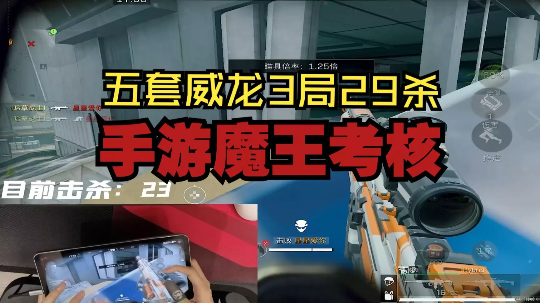 这是《王者荣耀》的游戏操作展示,玩家采用单人双排欧美打法,同时操作两台设备分别使用射手和辅助,呈现射手辅助配合的对战操作画面。