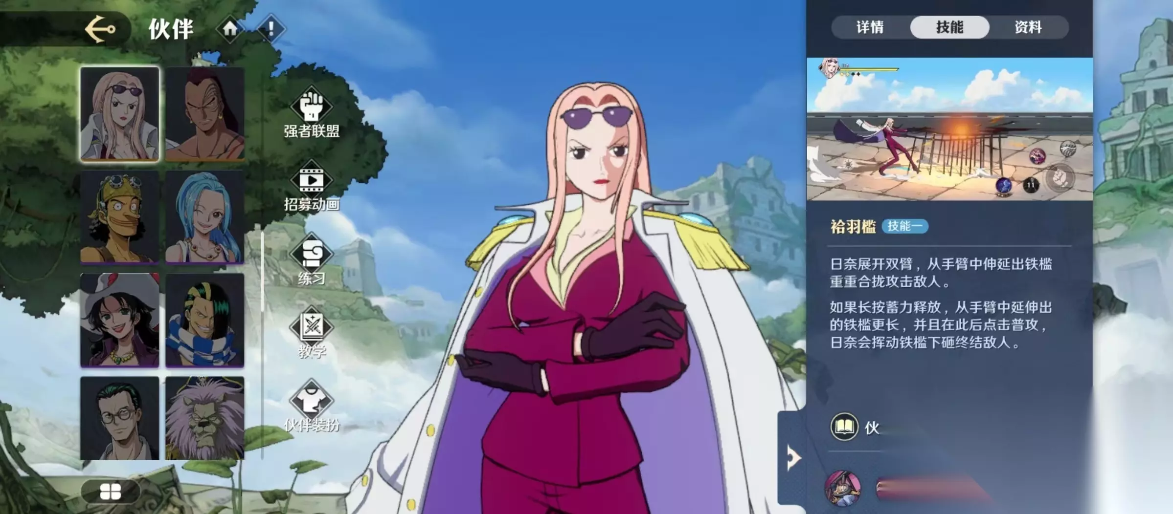 还有一个被动技能海军将校,当日奈出战的时候,强高和芬布迪将会作为观众观战。日奈完成一次特殊处决技,强高和芬布迪就会进入崇拜状态。通过部下助战,可以呼唤强高和芬布迪支援,当日奈被持续攻击一段时间后,两人则会进入到愤怒状态,通过部下复仇,召唤强高和芬布迪攻击,这时日奈就可以脱困。第1个主动技能的效果是从手臂中延伸出铁槛攻击敌人,如果采用长按蓄力的方式,那么伸出来的铁槛将会更长,并在此后点击普攻挥动铁槛终结敌人。