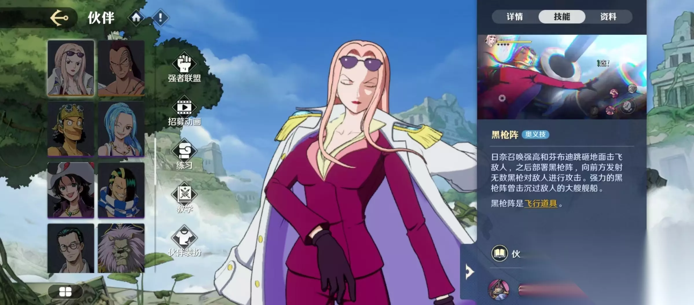 第2个主动技能是伸出手臂后向前突进一段距离,如果成功穿越敌人会补上一记攻击。奥义技能黑枪阵,召唤强高和芬布迪将敌人击飞,之后部署枪阵,向前方发射黑枪进行攻击。这一招的威力非常大,强力的黑枪阵曾经击沉过敌人的大型舰船,所以威力可想而知。
