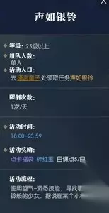 逆水寒手游:如何完成银铃冒险? 声音如银铃怎么做? 金言童子位置:汴京(640,615) 每天都有新的任务发布,每天18日:00-23:59可以完成任务。