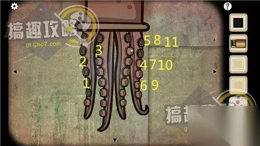 然后看到章鱼触手,这边就是点击看到规律让触手的洞全部打开即可(小编在图中标记出的点击顺序只针对没有自己乱点刚开始的玩家,如果玩家自己点过试着通过那顺序就完全不一样了,剩下也就只能靠你自己,因为这边即使返回也是不会重置的。)