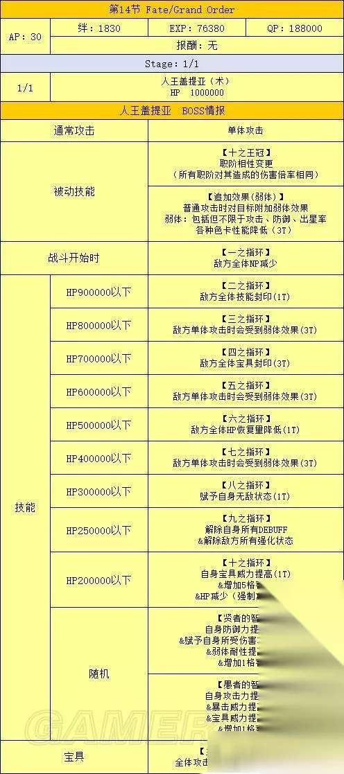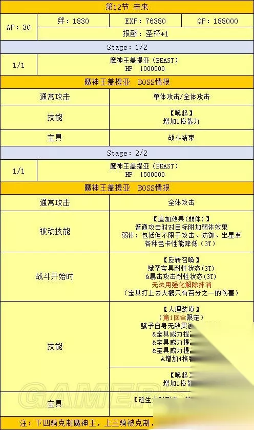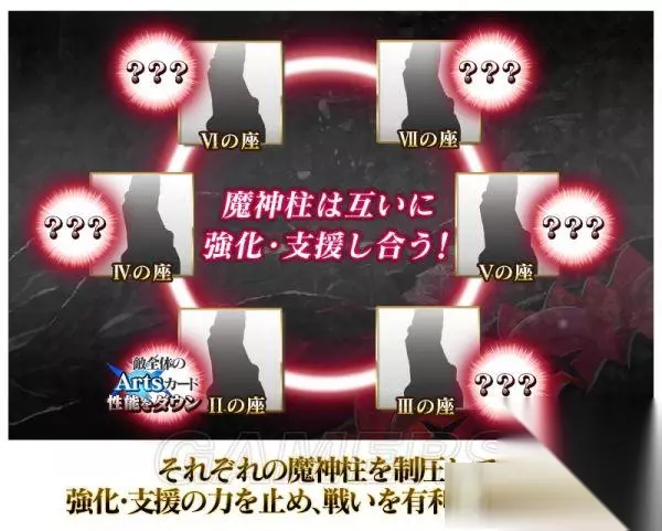 在制压战中的魔神柱会相互支援其他的魔神柱 支援的效果相当强力,被完全击破的魔神柱会变得无法提供支援 优先压制具有棘手效果的魔神柱,控制住支援吧! 支援效果 II之座——枪柱:敌方全体Arts性能降低50% III之座——术柱:敌方全体Buster性能降低50% IV之座——杀柱:赋予自身无敌贯通状态 V之座——狂柱:自身暴击率提高 VI之座——骑柱:敌方全体Quick性能降低50% VII之座——弓柱:敌方全体HP恢复量降低50% X之座——剑柱:强化解除耐性提高(1次) 羁绊等级特攻