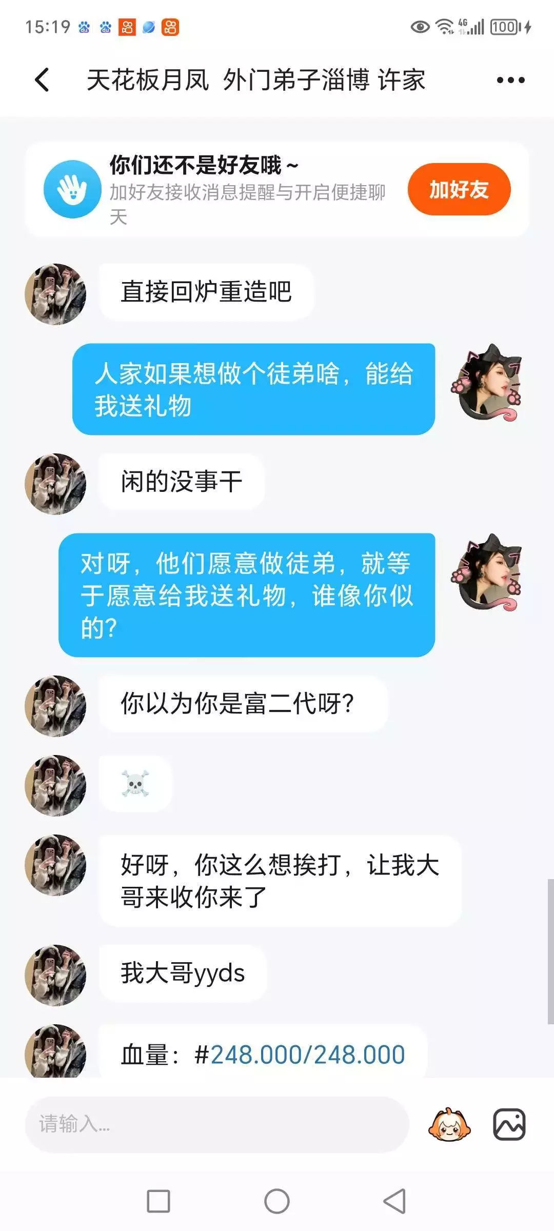 不是我请问呢?人家愿意认我做师傅,那就等于自愿给我送礼物,我的名字明确的写着可收徒,先送我礼,还是看不懂人字啊?还让你大哥来打我,你大哥血量这么高,你怎么不让你大哥带带你呢?