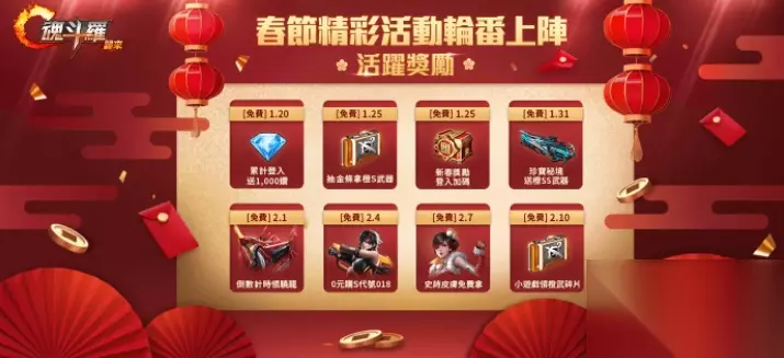 魂斗罗:归来全新战甲型态:神驭骁龙现身 好康活动春节好康来点不一样的,精彩免费活动轮番上阵! 贺新年,迎新年!魂斗罗:归来官方大手笔加码推出新年活动,自1/20改版开始就好康不断。不仅累积登入就送1,000钻、死亡卫星之盾碎片和异能天赋精华,1/31参加珍宝秘境活动,更可免费拿最新橙SS武器-喷冰枪;另外,1/2过年当天登入游戏,即可免费拿全新输出战甲-神驭骁龙!2/7开工日当天,只要收集018围巾,即可兑换全新史诗造型-元夜笙歌。
