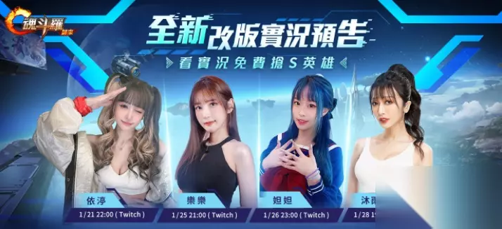 魂斗罗:归来1/20 全新异星崛起,燃魂宇宙版本,强势登场! 实况合作看实况抢S级英雄女神实况主齐聚魂斗罗战场! 为了让玩家更了解本次魂斗罗:归来全新改版的宇宙魅力,特别邀请到四位实况女神来陪战士们射起来!分别是:钓虾女神-沐雨柔、甜心教主-依渟、俏皮公主-妲妲咬果冻和气质女孩-乐乐依梨Lebaby。在直播同时,将开放与实况女神一同游乐的机会,抢先体验异星迷航爽快射击的乐趣,以及版本最强新SS级英雄星际爱丽丝,带领玩家一起进入超越现实的异世界,一同抵抗外星异形入侵。 此外,官方特别加码,只要在直播期间观看实况,就有机会直接获得S级英雄-金属比尔和多项限量虚宝! 魂斗罗:归来直播列表: 1. 依渟:1/21五 22:00 Twitch 2. 乐乐:1/25二 21:00 Twitch 3. 妲妲:1/26三 23:00 Twitch 4. 沐雨柔:1/28五 19:00 Youtube