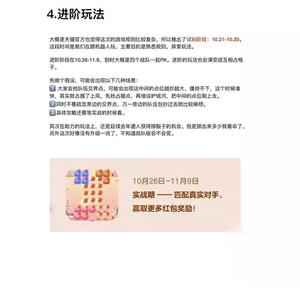 玩法攻略 在如此条件下,就如上图而言,左下角的第一块红色18的数字格子,是完全不用积累到这个数值的,因为这才只是你踏入江湖的第一步!这里只要是初始数字(即一次投掷骰子的点数)即可。只要你的龙头部队能够快速的进军对方阵地,后面的格子完全不用防守!所谓最锋利的矛就是坚韧的盾!减少无作用的防守,将剩下的糖果支援前方阵线! 兵法中“临兵斗者皆阵列在前”,也有接近的意思! 1.一夫当关万夫莫开!! 当你迅速集结部队冲出自己的大本营前往中原群雄逐鹿时候,这时候看对方的实力,如果实力相当,那就按照上图一样,将四个最关键的点位站住,重兵把守!让各路诸侯看到你就望而生畏,23这个点位也不是很高,但是相比其他家,我估计优先攻打我的概率就不高了!