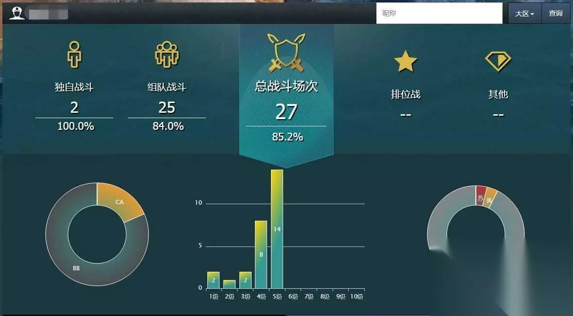 【1】总场次包括排位战场次和PVP场次,不包括PVE场次,场次横线下方是胜率。 三个图从左到右分别是各类型军舰场次分布,各等级场次分布,各国家场次分布。