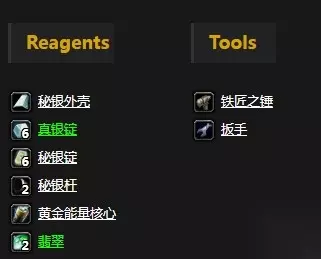 需要工具:铁匠之锤、扳手 需要素材:秘银外壳x1、真银锭x6、秘银锭x6、秘银杆x2、黄金能量核心x1、翡翠x2 学习等级:工程学230 学习自:在荆棘谷藏宝海湾和铁炉堡的地精工程学训练师处学习