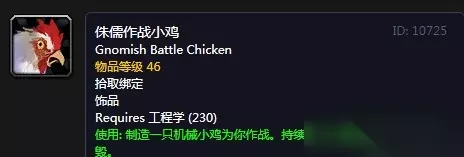 魔兽世界怀旧服侏儒作战小鸡 装备效果: 饰品 主动:制造一只机械小鸡为你作战。持续90秒或者直到小鸡被摧毁。