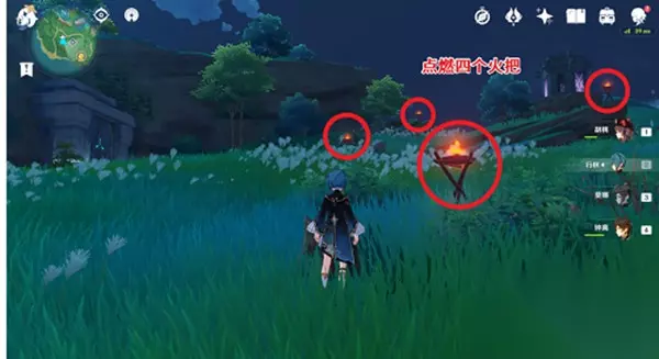 5、这个任务需要点燃上图的四个火把,点燃火把没有顺序,只需要把这四个点燃即可,然后就能启动机关,开启秘境了。