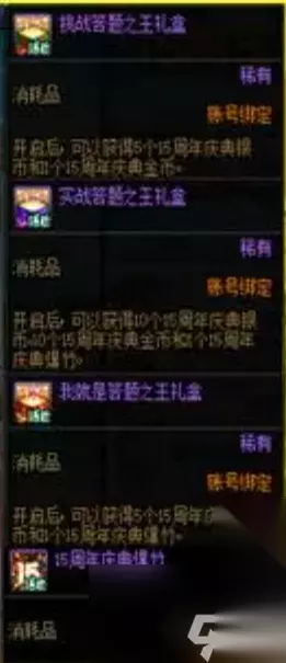 六、礼盒奖励介绍 1、开启每日礼盒能够领取15周年庆典银币*5、15周年庆典金币*5。 2、每周累积3次礼盒可以领取15周年庆银币、15周年庆金币,庆典宝竹*1。 3、累积开启礼盒10次可获得15周年金币*5和周年庆爆竹*15。 4、金币和银币可以在商店兑换各种稀有道具,开启爆竹后可在5/10张成长券、1/3/50张成长券中获得一个。 dnf15周年欢乐答题答案 一、选择题 1、下列哪一个职业不可以为队友提供25%技能攻击力( ) A、神龙天女 B、铁血统帅 C、破晓女神 D、念帝 2、下列哪一个职业没有劳动节的两级BUFF称号( ) A、念皇 B、念帝 C、月影星劫 D、正义仲裁者 3、下列哪一个称号与其他三个不是同一节日礼包可以获得的( ) A、继承者 B、权贵者 C、荣耀贵族 D、哥特绮梦 4、下列固伤职业,( )与其他三个不同 A、帝血弑天 B、龙神 C、混沌行者 D、风暴女皇 5、亡者峡谷地下城中( )地图共45层 A、迷妄之塔 B、死亡之塔 C、绝望之塔 D、悲叹之塔 6、在所有地下城中怪物中,( )种类最多 A、史莱姆 B、哥布林 C、章鱼 D、蜘蛛 7、春节套附赠宠物第一次增加技能等级是( ) A、2013 B、2014 C、2015 D、2016 8、城镇NPC数量最多的是( ) A、分解修理机 B、阿尔伯特 C、使命公告栏 D、臭水沟公主 9、(多选)女鬼剑最先开放的两个转职职业是( ) A、驭剑士 B、暗殿骑士 C、契魔者 D、流浪武士 10、(多选)下列拥有多种防具精通的职业是( ) A、黑暗武士 B、缔造者 C、真龙星君 D、诱魔者 二、填空题 1、地下城与勇士的官方小说名字是《 》 2、“突击队长的机械腿甲”是目前版本 、 (职业)完美换装必备 3、2017年六月更新的新一款天空是第__期天空 4、通过商城可以直接用金币购买的契约是 5、商城道具“角色更名卡”更改角色ID之后 天内无法再次更改 6、商城道具“自动修理”,每个角色每天限制用 次 7、“团长”、“卧槽”分别是职业 、 的外号 8、被称为“极限冰属强”的史诗套的套装名字是: (不包括增加全属强的史诗防具) 9、装备“盗墓王的弥留之戒”想要达到最高效果时,需要角色背包内有 金币 10、国服首发副本——超时空之战是在2017年 月在国服登场 三、简答题 1、请简述皎月之哈尔巴特的攻击模式 2、请简述暗之恶魔、光之恶魔的攻击模式 四、判断题(附加题——老玩家必做) 1、Lv60版本的“僵尸王”指的是地下城“暗黑雷鸣废墟”—( ) 2、武器“锋利的长刀”是全职业仅有的一把自带属性攻击的蓝色武器,等级为17级,属性为光属性攻击——————( ) 3、Lv60版本时期材料“无色小晶体”占负重——————( ) 4、所有地下城中,熔岩穴与迷乱之村哈穆林是拥有领主最多,共有三个——————( ) 5、被称为“一刀哥”的是暗影迷宫领主——影子剑士刹影————( ) 6、Lv60版本女魔法师的职业导师是艾丽丝————( ) 7、请写出Lv60版本六张异界地下城的名字 参考答案: 一、1~5:A B D C B 6~10:B C A AC ABC 二、 1、最后一个使徒 2、狂战士 契魔者(帝血弑天 弑神者) 3、十一 4、晶体契约 5、九十 6、六 7、炎狱裁决者 暗街之王(异端审判者 男街霸) 8、怒海狂鲨 9、一亿 10、 六 三、略 四、1~6:√ × √ × √ × 2、12级武器,并非17级。 4、领主最多地图是遗忘之地,共八个,并非熔岩穴、迷乱之村哈林各三个领主 6、导师是莎兰,并非艾丽丝。 7、哥布林王国、蠕动之城、兰蒂卢斯的鹰犬、黑色大地、巴卡尔之城、虚无之境