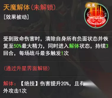 或者如果阵容中拥有【重楼·魔临九天】等强力伙伴也可以通过他们来进行化解; 【重楼·魔临九天】 技能分析: 他的被动“天魔解体”受到致命伤害时,清除自身所有负面状态并恢复至50%最大精力。