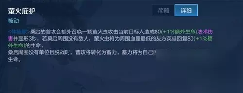 在王者荣耀新赛季更新之后,又有一位新英雄加入了王者荣耀的大家庭,他就是桑启,由于新英雄刚上线不久,所以很多玩家还不知道桑启怎么玩法,还不知道的小伙伴们赶紧来跟小编一起往下看看吧。 王者荣耀桑启玩法攻略 1、技能介绍 ①、被动技能:普攻变成萤火虫攻击目标,如果没有敌人,可以为血量最低的队友回复生命值,如果身边没有任何可攻击的单位,且自身脱战的状态,可以为自己蓄力回血。在身边没有敌人的时候,普攻会增加一个特效,按住进入蓄力状态,之后自身持续回血。