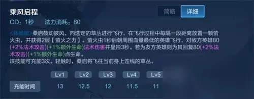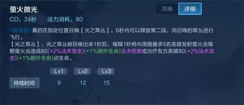 ③、二技能:二技能是个位移技能,可以选定一个草丛进行飞行,落地后获得2层萤火之力,也就是被动的萤火虫,路径中放置萤火虫,会在一秒后朝着附近血量最低的英雄飞行,对敌人造成伤害和显形,对友方回复生命值,可以充能三次。