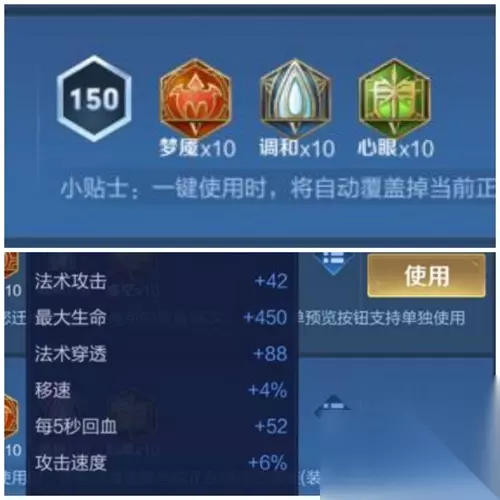 2、铭文推荐 ①、10个梦魇、10个调和、10个心眼。效果;法术攻击增加42,法术穿透增加88,移速增加4%,最大生命增加450,攻击速度增加6%,生命回复5秒增加52。