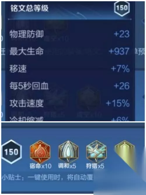 ②、5个调和、5个狩猎、10个宿命、10个虚空。效果:物理防御增加23,冷却缩减6%,移速增加7%,最大生命增加937,攻击速度增加15%,生命回复5秒增加26。