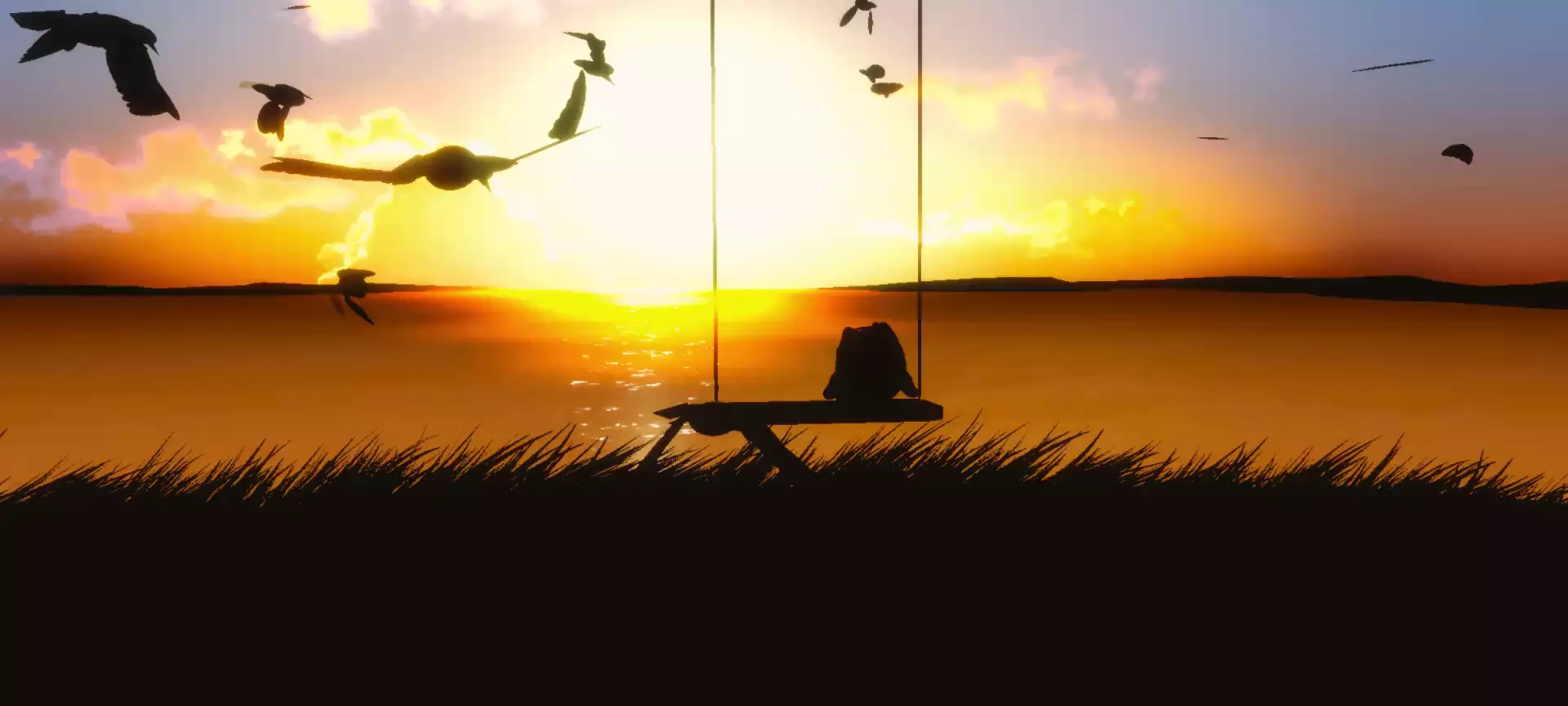 晚霞的一天。坐在秋千上的微风。