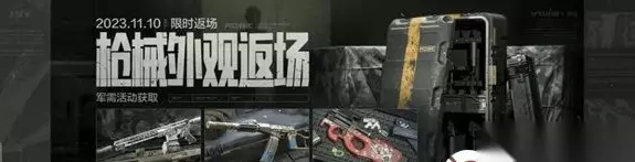 枪械典藏 活动时间 2023年11月10日开启 活动说明 活动期间,消耗军需卡即可参与活动,每次参与可获得不同数额的工坊纪念币,更有机会获取【典藏纪念币】以及【黑金国际·M110】、【白狼连队·AK74N】等枪械涂装奖励! 黑金国际·M110 白狼连队·AK74N 【典藏纪念币】可直接兑换返场的枪械涂装【黑金国际 · M4A1】、【白狼连队 · VSS】、【兔年春季限定 · P90】!【工坊纪念币】可兑换奖池内其他物品。 黑金国际 · M4A1 白狼连队 · VSS 兔年春季限定 · P90 注:活动中的蓝色、绿色品质枪械涂装会重复获得,重复获得的枪械涂装会按价值分解成军需外观币。 *【工坊纪念币】和【典藏纪念币】活动结束后会被清除,请及时使用!