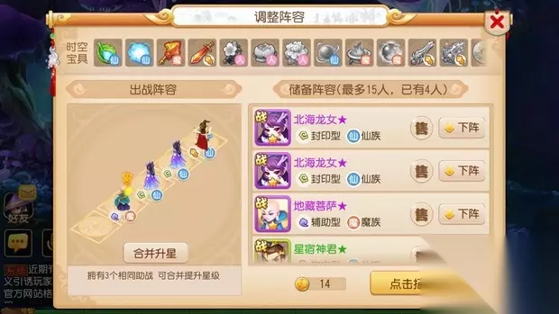 助战升星: 1、在时空秘境中,如果有3个相同的助战是可以来点击升星的,这会让你的助战更加的强力; 2、助战可以通关刷新招募来获得,当然不同品质的助战也是需要消耗不同数量的秘境币。