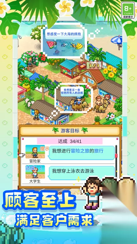 开罗社一款主打海岛度假主题的经营模拟类手游,玩家可建造住宿、娱乐等各类设施,并通过合理组合建筑触发景点加成效果来吸引游客,制定旅游计划,针对不同人群设计方案来增加收入,同时要维护岛屿生态,通过改善水质、放养鱼苗提升海岛魅力值,游戏有多样地形和可拓展区域可供玩家解锁,而且加入了多线剧情和成就系统。 高速下载 普通下载 优先233乐园APP下载 开罗社自2007年创立以来推出了几十款游戏,这些游戏无一例外都是小体积像素风经营模拟类游戏,在游戏技术和设备发展的如此完善的当今,开罗社能用像素画面让玩家沉浸在游戏里,真真正正就是靠着游戏内容去吸引玩家,就像开罗社创立者说的那句话一样,没必要去做出几百万人都支持的游戏,而是牢牢抓住10万人心灵的游戏。