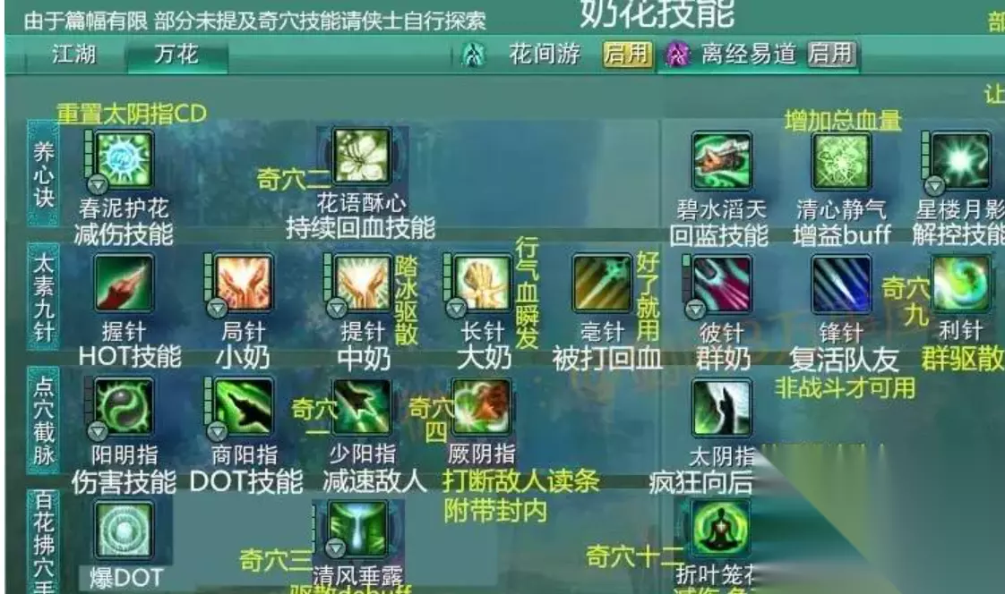 二、双心法加点攻略 由于双心法在技能方面的加点是有所不同的,因此就讲一下相同的加点攻略,第一个技能是星楼月影,可以解除自身的控制以及技能的cd,是关键的保护技能,需要优先加满。