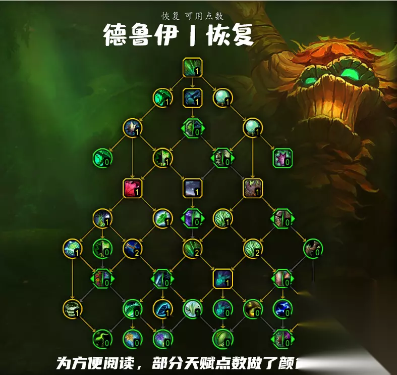 第一行 生命绽放:在15秒内为目标恢复生命值。当生命绽放效果结束或被驱散时,目标会立即恢复生命值。同一时间内只能在一个目标身上生效。 第二行 伊瑟拉之赐:每5秒为你恢复3%的最大生命值。如果你的生命值已满,则会治疗一个受伤的团队或小队成员。 自然迅捷:你的下一个愈合、复生或纠缠根须变为瞬发、不消耗资源、可以在所有形态下施放并且治疗量提高100%。 清晰预兆:生命绽放的持续治疗效果有4%的几率使你获得节能施法效果,你的下一个愈合不消耗法力值。 第三行 林地护理:迅捷治愈在9秒内为目标恢复生命值。 二选一:自然的壮美:自然迅捷对愈合的治疗加成提高35%。 or 季节变迁:自然迅捷的冷却时间缩短12秒。 明晰闪愈:通过节能施法施放的愈合能够额外造成30%的治疗效果。 第四行 梦境初酲:伊瑟拉之赐现在毎4秒治疗一次,并且每个激活的回春术都会使其治疗效果提高8%。 强化愈合:如果目标已经受到愈合影响,则愈合的初始治疗的爆击几率提高40%。 二选一:丰饶:每一个激活的回春术可使你的愈合的消耗降低5%,爆击几率提高5%。 or 塞纳里奥结界:保护一个友方目标,持续30秒。受到的任意伤害都会消耗结界,并在8秒内为目标恢复生命值。 滋养:为一个友方目标恢复X生命值。获得三倍的精通:相生增益。 第五行 百花齐放:在目标位置处生长出一片治疗之花,每2秒为10码范围内3个受伤的盟友恢复生命值,持续30秒。同一时间只能放置1个百花齐放。 宁静:在8秒内为40码范围内的所有盟友恢复生命值。每次治疗为目标恢复少量生命值,持续8秒,此效果可以叠加。不在团队中时,该治疗效果提高100%。 铁木树皮:目标的皮肤变得像铁木一样坚韧,受到的所有伤害降低20%,持续12秒。 第六行 丛林之魂:迅捷治愈会使你的下一个愈合或回春术的治疗效果提高150%,或使你的下一个野性成长的治疗效果提高50%。 栽培:当回春术治疗一个生命值在60%以下的目标时,会对目标施放栽培,在6秒内为其恢复生命值。 二选一:平常心:宁静的冷却时间缩短60秒。引导宁静时,你受到的伤害降低20%,而且你免疫击退效果。 or 迷梦:引导宁静时,你的其他德鲁伊法术的冷却时间降低最多15秒。 强化野性成长:野性成长额外治疗1个目标。 二选一:石木树皮:铁木树皮会使你的持续治疗法术的治疗效果提高20%。 or 强化铁木树皮:铁木树皮的冷却时间缩短20秒。 第七行 新绿:生命绽放进行最终绽放时,可以治疗最多3名拥有你的百花齐放效果的目标,使其恢复点生命值。 快速生长:愈合在持续期间的恢复提高50%,并且其持续治疗效果也会作用于你的生命绽放的目标。 赋新源生:对低生命值目标的治疗效果提高,回春术最多提高[10/20]%,宁静最多提高[15/30]%。 祥和绽放:生命绽放可提供[2/3]层精通:相生。 狂野生长:野性成长的治疗效果随时间衰减的幅度降低[15/30]%。 再生心木:受到你的铁木树皮保护的盟友也会从你所激活的所有回春术中受到75%的治疗。 第八行 二选一:春暖花开:每个受到百花齐放治疗的目标将在6秒内额外恢复生命值。 or 过度生长:立即对目标施加生命绽放、回春术、野性成长和愈合的持续治疗效果。 二选一:化身:生命之树:进入生命之树形态,治疗效果提高15%,护甲值提高120%,并免疫变形效果。得到强化的法术:回春术、野性成长、愈合和纠缠根须。持续30秒。你可以在持续期间在其他形态与生命之树之间切换。 or 万灵之召:召唤德鲁伊先祖爆发出能量,在4秒内连续快速地引导16个德鲁伊法术和技能。你会根据当前的形态对附近合适的目标施放野性成长、迅捷治愈、月火术、愤怒、愈合、回春术、斜掠和痛击。 激变蜂群:召唤虫群,在12秒内为目标恢复生命值或造成暗影伤害,并且使你对目标的周期性效果提高25%。在效果结束之后会转移到另一个目标身上,倾向于在盟友和敌人之间转移,最多转移3次。 二选一:翡翠灌注:迅捷治愈不再消耗一个持续治疗效果,并使你在目标身上的持续治疗效果的持续时间延长12秒。 or 繁盛:使你对60码内友方目标的所有持续治疗效果的时间延长8秒,并使你的持续治疗效果提高100%,持续8秒。 第九行 生死循环:你的持续伤害效果造成全部伤害所需时间减少25%,你的持续治疗效果造成全部治疗所需时间减少15%。 萌芽之叶:生命绽放每次治疗时的恢复效果提高3%,最多提高45%,还会使生命绽放的最终绽放治疗量提高7%。 塞纳留斯的指引:化身:生命之树期间,你每5秒获得次节能施法效果。生命绽放产生绽放效果时,化身:生命之树的冷却时间缩短2.0秒。愈合的初始治疗爆击时,化身:生命之树的冷却时间缩短1.0秒。万灵之召的冷却时间缩短50%,持续时间缩短25%,使用的法术数量降低25%。万灵之召使用特殊法术或技能的几率提高。 不羁蜂群:激变蜂群在每次跳跃时有60%几率分成两个蜂群。 肥沃土壤:回春术有[1/2]%的几率在一个附近目标身上生成一个新的回春术。 自然智慧:如果你对其他人施放激活,你会获得其100%的效果。你的法力回复速度提高5%。 滋养休眠:当你对生命值全满的目标施放回春术时,它的持续时间会延长1秒,每次施放最多可延长3秒。 第十行 光合作用:当你的生命绽放施放在自己身上时,你的周期性治疗效果的治疗速度提高20%。当你的生命绽放效果在盟友身上时,你在其身上的周期性治疗效果有4%几率使其绽放。 蔓生绽放:你的生命绽放可以