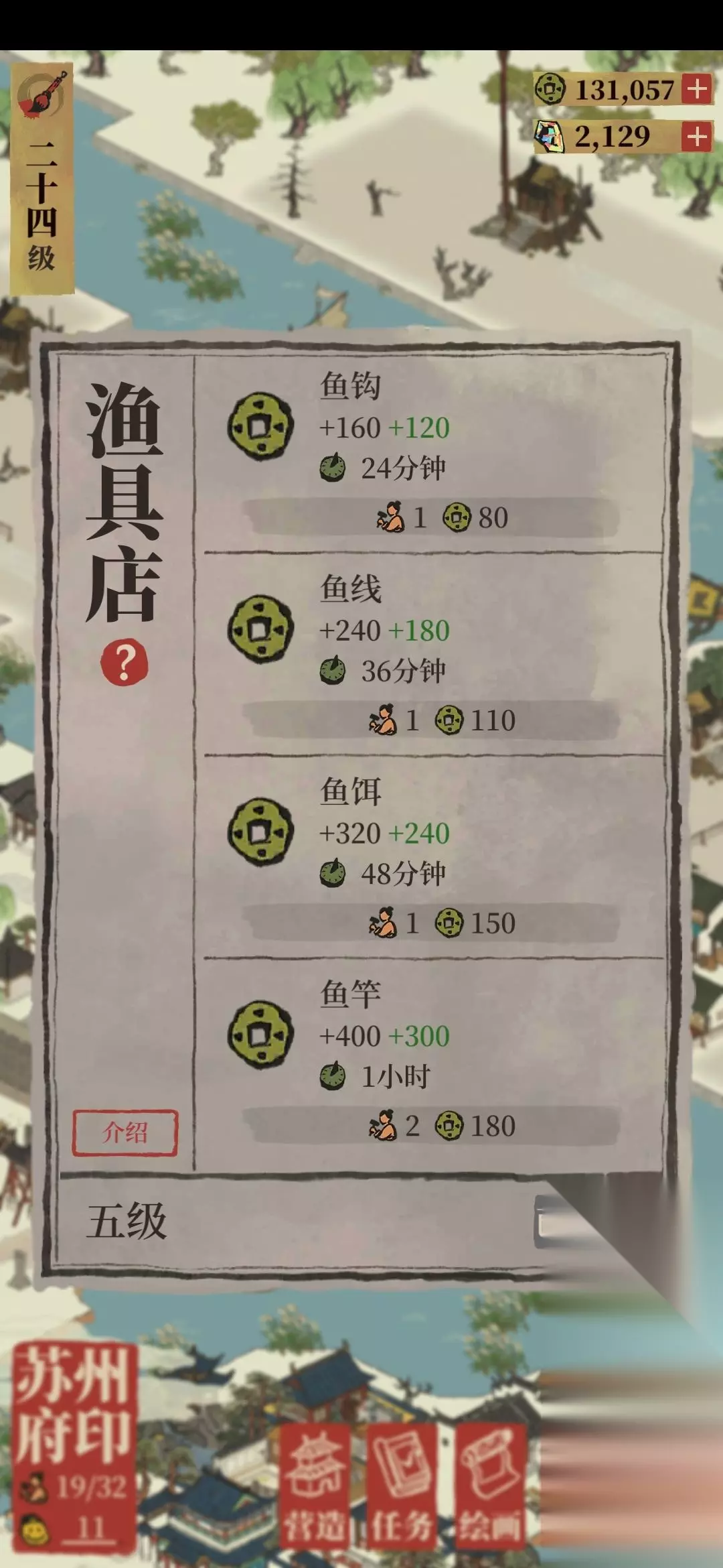 第二种:画室/苏州府:渔具店、丝绸点、灯笼店、木炭店 要用补天石升到满级,生产时间可以减半,满级后的产出分别为: 画室:350+175=525,45分钟 渔具店:400+300=700,60分钟 丝绸店:450+337=787,60分钟 灯笼店:500+375=875,90分钟 木炭店:650+325=975,90分钟