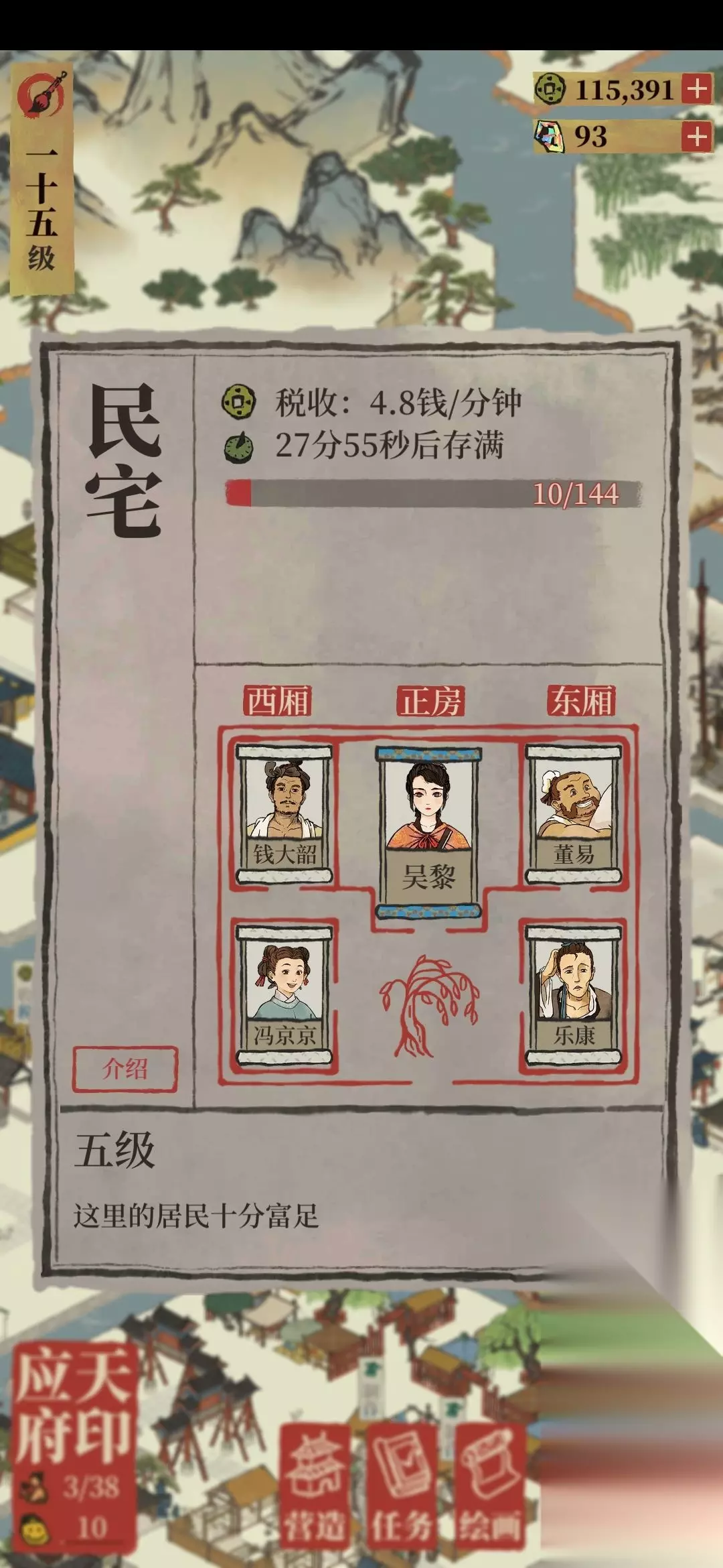 第三种:民宅 没错,民宅的好处在于,其他水井、画院都是每次要点生产才能出铜钱,而民宅只要你设置税课司,它就会一直自动帮你收铜钱。所以尽可能都升满级。如图5级民宅收入