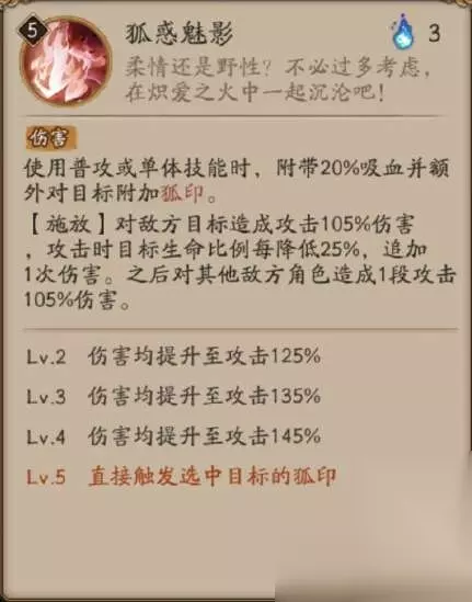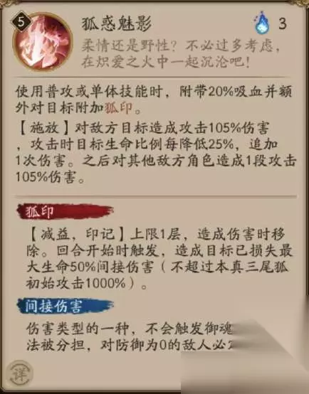 大招:狐惑魅影 伤害 使用普攻或单体技能时,附带20%吸血并额外对目标附加狐印。 【施放】对敌方目标造成攻击105%伤害,攻击时目标生命比例每降低25%,追加1次伤害。之后对其他敌方角色造成1段攻击105%伤害。 狐印 【减益,印记】上限1层,造成伤害时移除。回合开始时触发,造成目标已损失最大生命50%间接伤害(不超过本真三尾狐初始攻击1000%)。 间接伤害 伤害类型的一种,不会触发御魂效果,无法被分担,对防御为0的敌人必定暴击。 Lv.2 伤害均提升至攻击125% Lv.3 伤害均提升至攻击135% Lv.4 伤害均提升至攻击145% Lv.5 直接触发选中目标的狐印