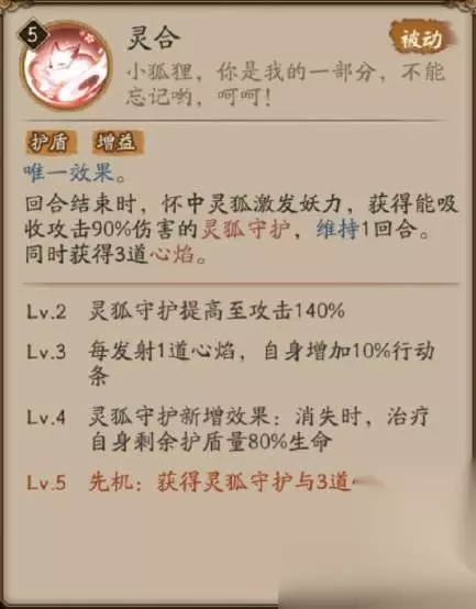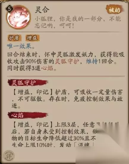 被动:灵合 护盾 增益 唯一效果。 回合结束时,怀中灵狐激发妖力,获得能吸收攻击90%伤害的灵狐守护,维持1回合。同时获得3道心焰。 灵狐守护 【增益,印记】护盾,可吸收一定量伤害,不可驱散。存在时,免疫控制效果与放逐。 心焰 【增益,印记】上限3层,任意目标行动后,若自身未受到控制效果,敌方非召唤物的目标生命降低超过30%且不少于最大生命上限10%时发动「汲魄」。 唯一效果 若是有多个同名式神在场,只有其中一个式神的此技能会生效。 维持 指此状态或印记,存在回合数以来源的回合计算,而非目标的回合。 控制效果 冰冻、沉睡、混乱、嘲讽、沉默、禁锢、缴械、变形、眩晕、挑衅、深度冰冻、影缚、霜冻、拘魂、沉沦以上均属于控制效果,后八者无法被驱散,霜冻无法被解除 汲魄 伤害 增益 鬼火 消耗1道心焰攻击对应目标,造成攻击198%伤害,连续攻击同一目标时伤害递减30%。 Lv.2 灵狐守护提高至攻击140% Lv.3 每发射1道心焰,自身增加10%行动条 Lv.4 灵狐守护新增效果:消失时,治疗自身剩余护盾量80%生命 Lv.5 先机:获得灵狐守护与3道心焰